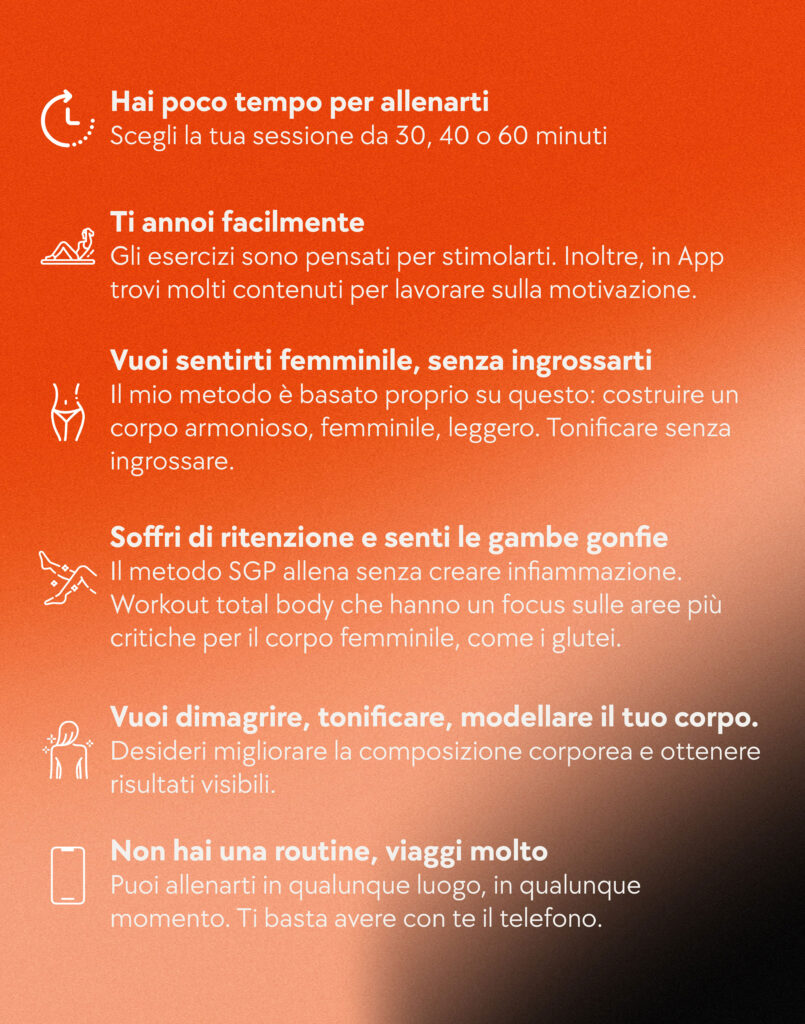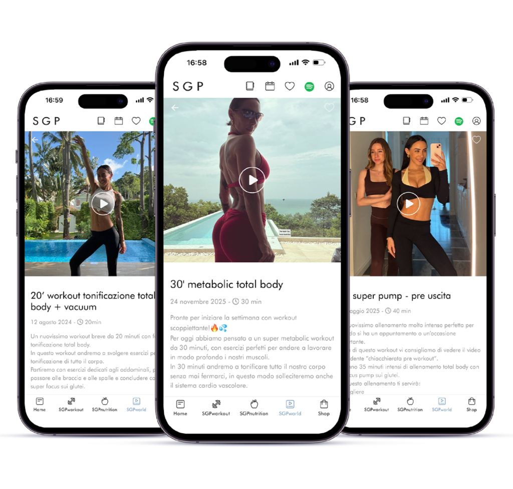 All’interno di SGP puoi scegliere liberamente l’allenamento che preferisci in quel momento: una scheda o un video workout. Sono tutti completi, total body e pensati per lavorare il corpo in modo armonico.